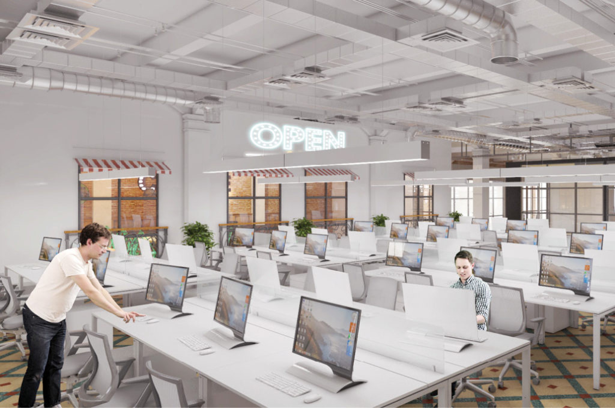 La espacialidad de la planta, generada por la altura del edificio (unos 4,50 metros de piso a techo), y los grandes ventanales que posee, le confieren luz natural a casi la totalidad del espacio y su planta libre de unos 1.500 metros cuadrados les dio a los arquitectos la posibilidad de desarrollar una propuesta conceptual en la que los empleados se sientan identificados con las nuevas oficinas.
