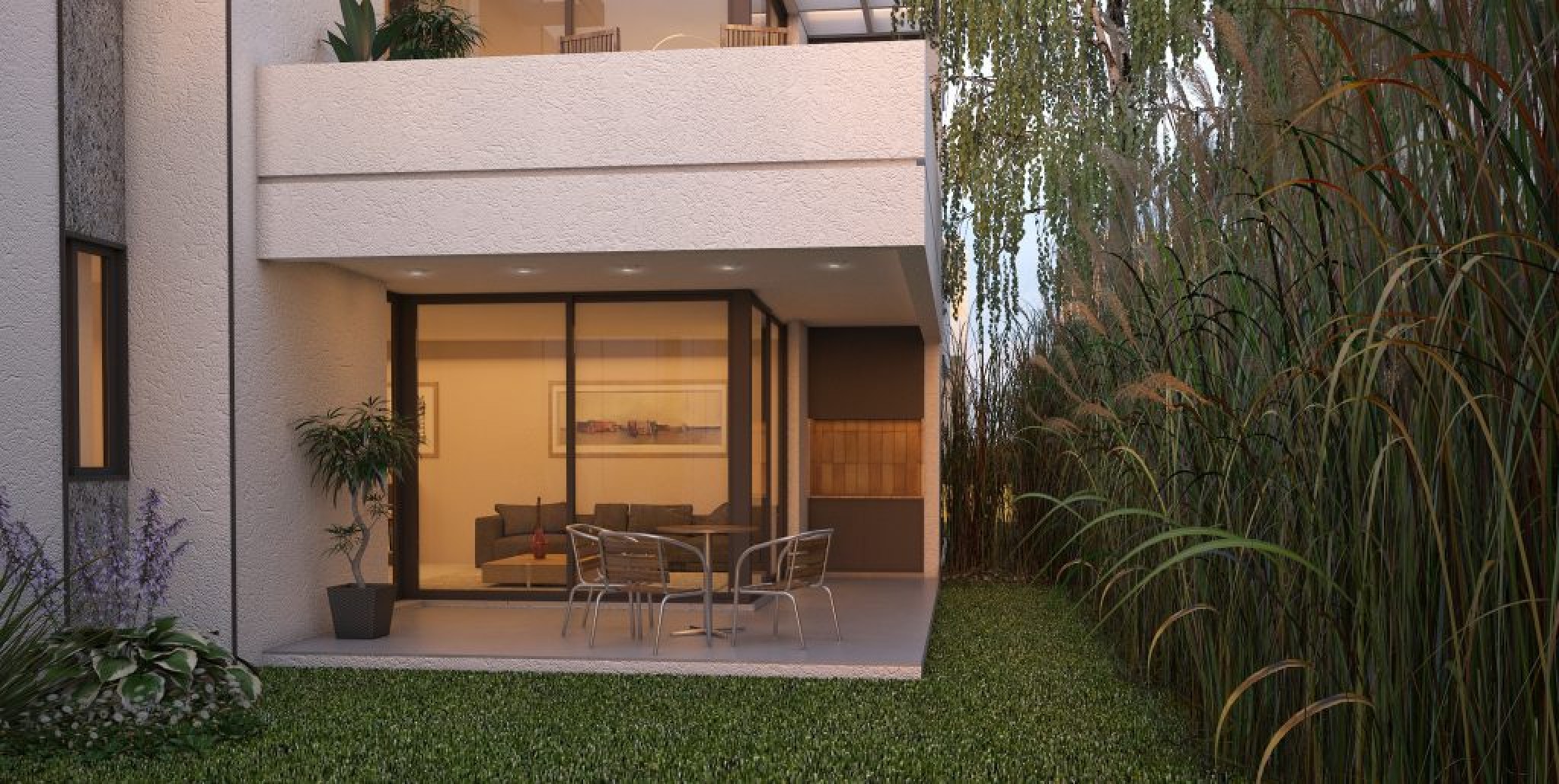 -Garden Suite es un departamento en planta baja con amplio living comedor, cocina, galería cubierta, jardín privado, dos habitaciones, una de ellas en suite, y dos baños. Es una propuesta de unos 200 m2 propios perfecta para adultos o familias jóvenes que disfruten de un jardín propio.