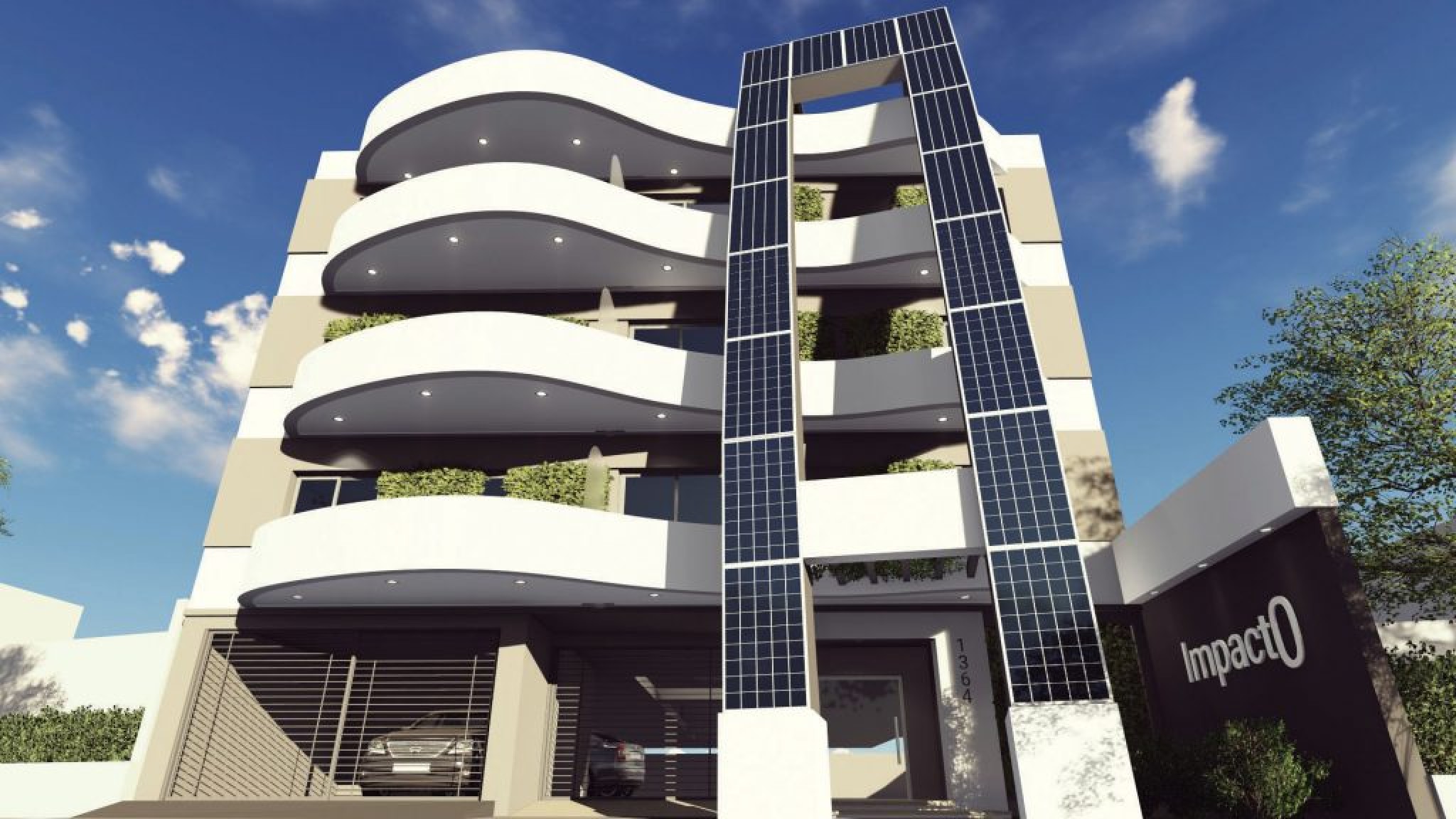 Impacto se erige como un edificio que en planta baja tiene dos accesos que conectan con cocheras y circulaciones internas hacia departamentos, áreas recreativas, cocheras descubiertas y bauleras de uso exclusivo para los primeros seis fiduciantes que ingresen. En los siguientes niveles se ubican 26 departamentos dispuestos en las plantas superiores.